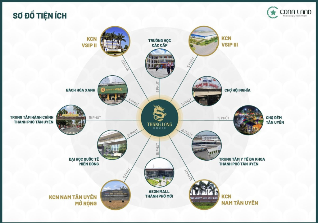 5 phút: VSIP III, VSIP II, Nam Tân Uyên, Nam Tân Uyên mở rộng, trường học các cấp, chợ địa phương, cửa hàng bách hóa, công an thành phố, …